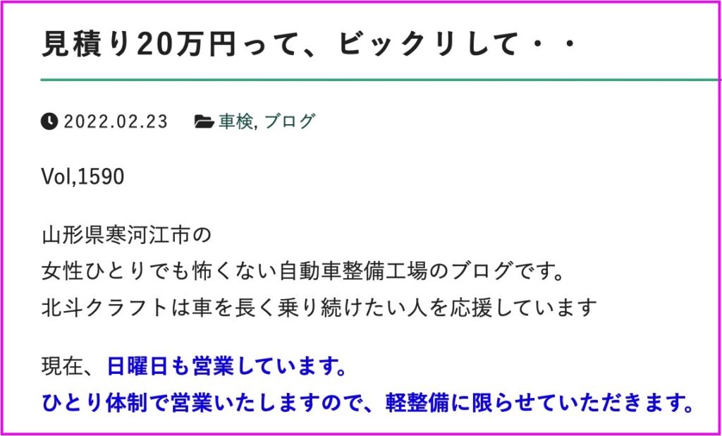 ホームページ:北斗クラフト / Facebookページ:女性ひとりでも怖くない寒河江の自動車整備工場【北斗クラフト】 / もうひとつのブログ:『ポンコツ会長とワクワクヒーローズ』